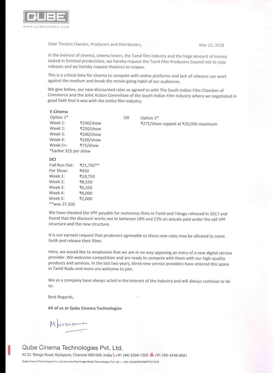 In the battle between Digital Service Providers' major player QUBE and the Tamil Nadu Film Producers' Council, QUBE representatives have issued out a statement appealing directly to the producers, theatre owners and distributors of the Tamil Film industry in lieu of the proposed strikes from March 16, 2018. It is worth mentioning here that the ownership of digital projectors, which remains the contention of the ongoing strike has not been addressed in the statement.