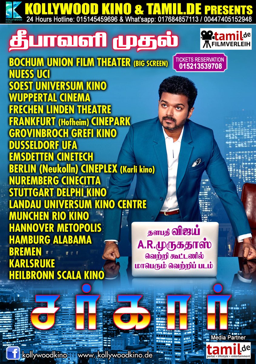 Sarkar is set to hit the screens worldwide for Diwali on November 6. Directed by AR Murugadoss, the political drama stars Vijay and Keerthy Suresh in the lead roles and has music by A.R. Rahman. The film is set to have a wider release in Europe. Kollywood Kino and Tamil.DE will be releasing the film in Germany. Here's the list of theatres screening the film in Germany.