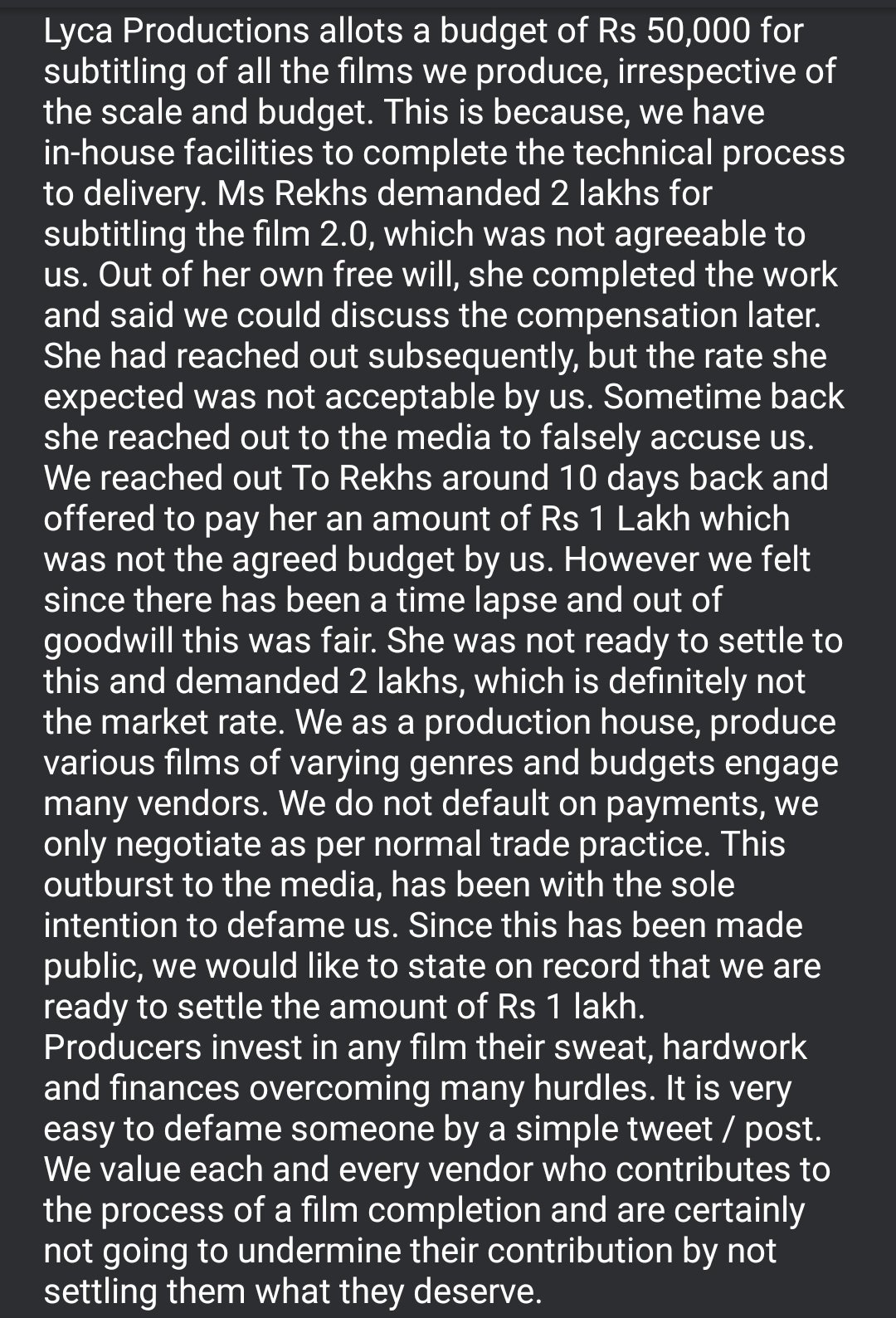 Earlier this month, subtitlist rekhs who had provided subs for the Tamil and Telugu versions of Rajinikanth's 2.0 had accused Lyca Productions of defaulting on her due payment. Her posts on twitter gained traction with many coming out in her support and Lyca finally responded to the allegations on August 28, 2019.