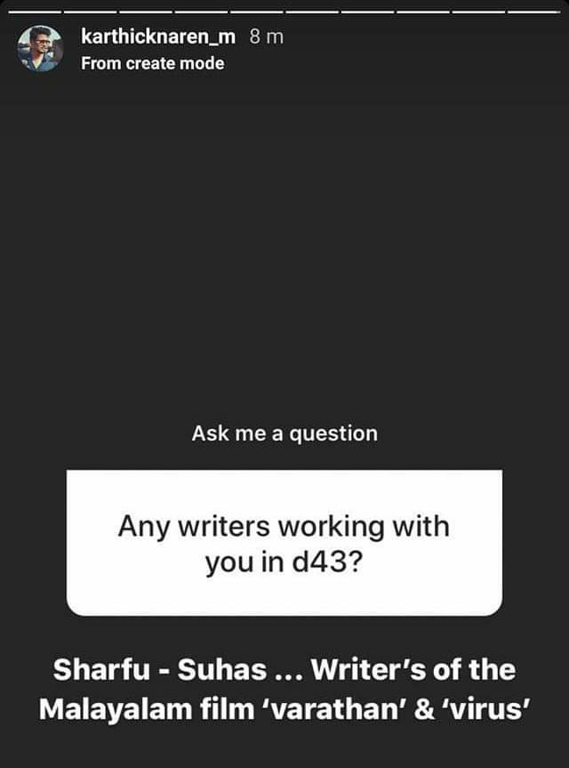 Last month D43, Dhanush's upcoming film with director Karthick Naren was announced by Satya Jyothi Films and recently in a social media interaction, Karthick revealed that the team has roped in Mollywood writers Sharfu and Suhas, famous for penning films like Varathan and Virus.