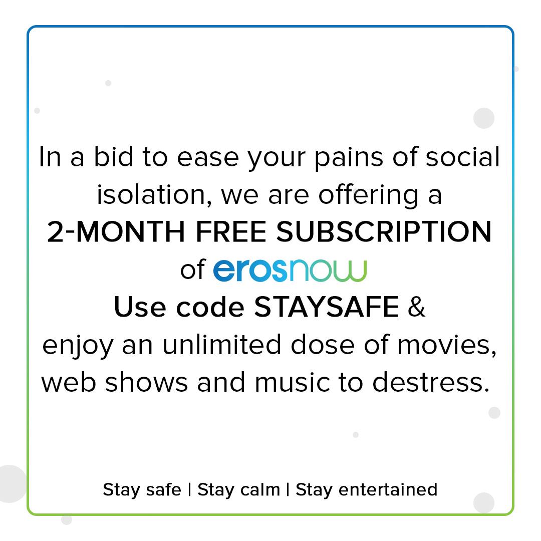 To make #quarantinetime with family easier, we're giving you a 2-month subscription entirely on us! Use code STAYSAFE and enjoy your favourite movies and shows. #Staysafe, and stay entertained with #ErosNow.#covid_19 #coronavirus pic.twitter.com/EHX7y1iJLW