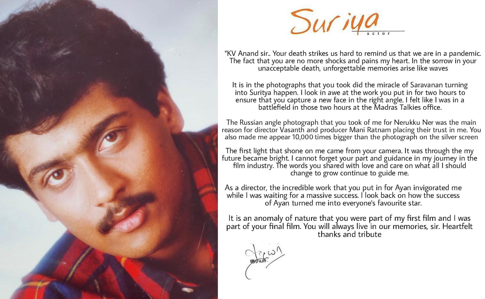 One of K.V. Anand's frequent collaborators from the Tamil film industry was actor Suriya. After the unfortunate demise of the cinematographer-director, Suriya was spotted visiting K.V. Anand's house and the hospital he was admitted in. Now, the actor has penned a heart-felt obituary for K.V. Anand, in which Suriya recalls how a photo capture by K.V. Anand changed the trajectory of his life.