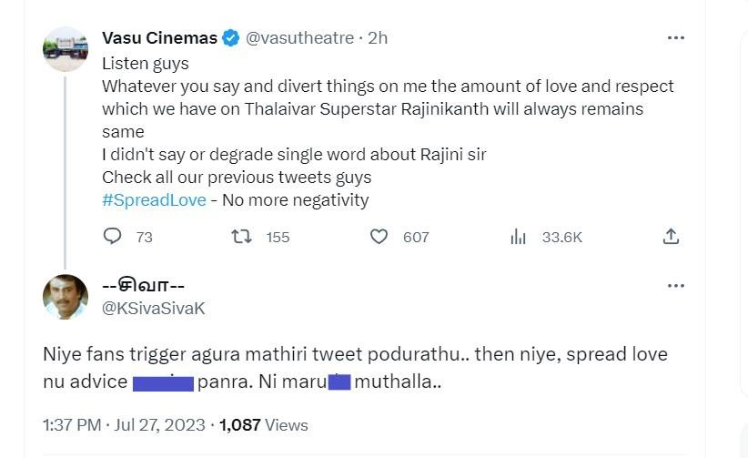 Vasu Theater's rooting of Vijay was put out post the release of Jailer third single Jujubee, and was hash-tagged with Leo, which releases only on October 19. Naturally, the already tensed equations between Rajinikanth and Vijay fans were triggered, sending the existing fan fights to whole new levels of low. Vasu Cinemas wasn't spared either, and their sinister tweets' blow-up was schooled by fans - mostly Rajinikanth's.