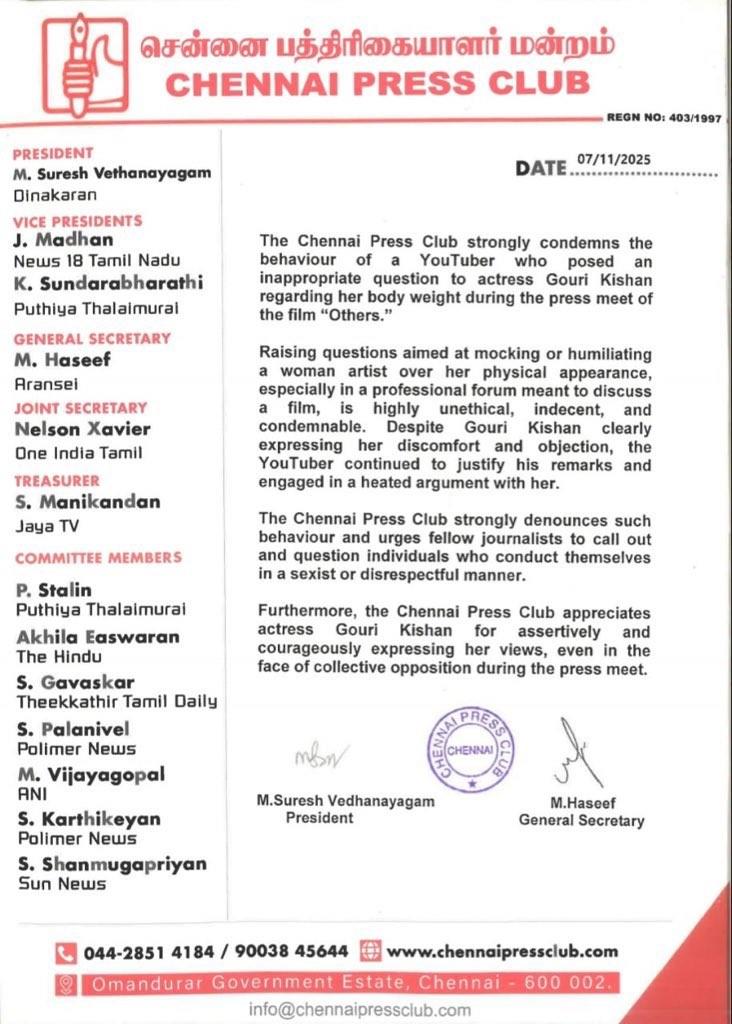 Since the incident, the Chennai Press Club has condemned YouTuber RS Karthik's behaviour as 'highly unethical' and 'indecent'. Gouri G Kishan's Others co-lead Aditya Madhavan has apologised for remaining silent during the incident, explaining that as a newcomer, he was unsure how to intervene at a public event.