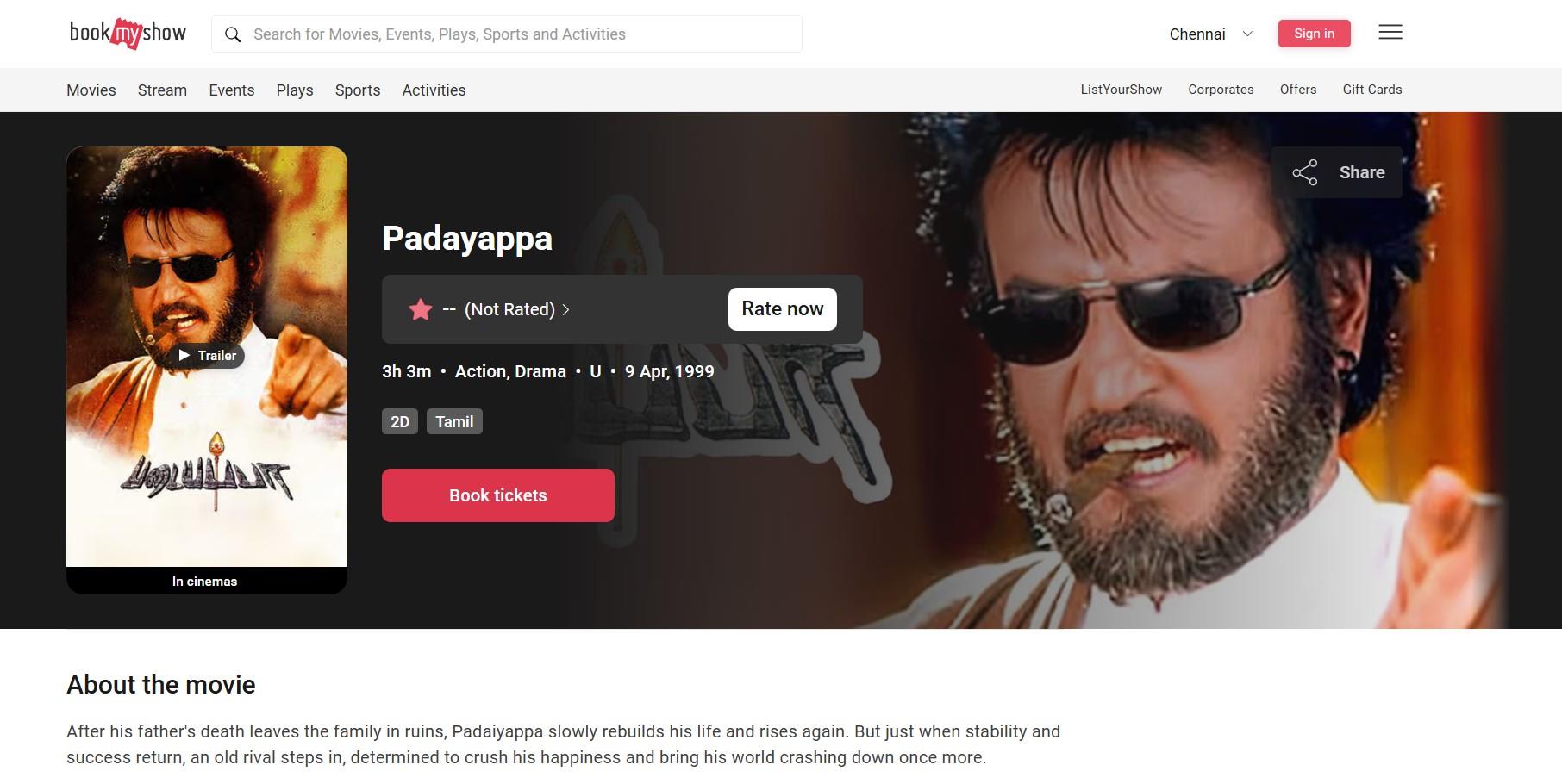Padayappa is also re-releasing in Singapore, Australia, and in Tamil Nadu, India. Outside Tamil Nadu, Rajinikanth fans are making do with the re-release of Sivaji: The Boss (2007) in Andhra Pradesh and Telangana, and Yajaman (1993) in Kerala.