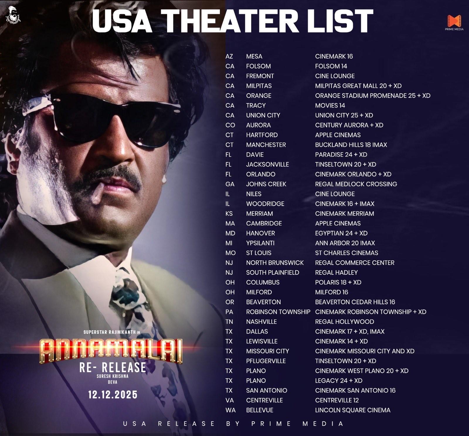 For a good chunk of 2025, vintage Rajini Tamil movie Annamalai (1992) was expected to have a grand re-release in India marking Rajinikanth's 75th birthday, and the Superstar completing 50 years in the Indian film industry. Annamalai is re-releasing on a grand scale however only in overseas locations like USA, and France. Bookings for Annamalai rerelease in India hasn't opened yet, so it remains unclear whether the remastered version of the movie will be hitting theater screens in Tamil Nadu or other states.