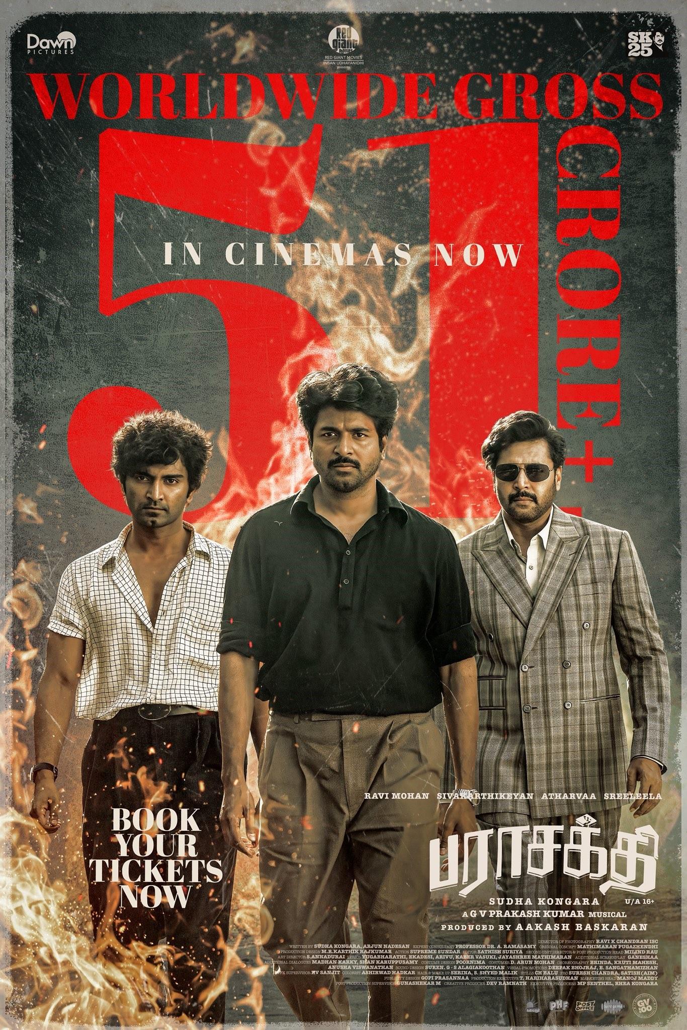 Tamil film Parasakthi released in theaters worldwide on January 10, 2026, and despite a strictly Tamil language release, the movie has managed to garner Rs. 51 Cr. in worldwide gross in its opening weekend collections. Dawn Pictures, the production house behind Parasakthi officially confirmed the film's opening weekend collections with a brand new poster featuring Sivakarthikeyan, Ravi Mohan, and Atharvaa.