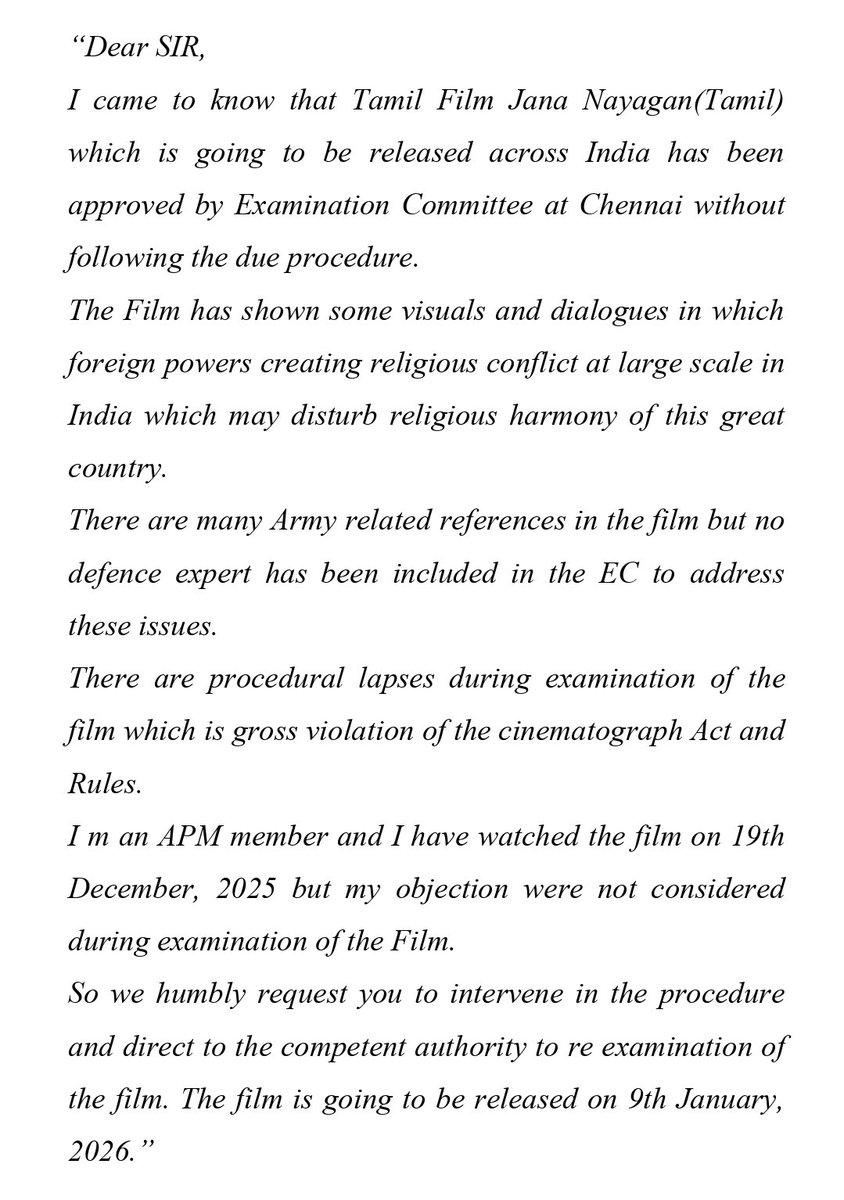 The complaint that triggered the Central Board of Film Certification (CBFC)'s referral of Jana Nayagan to a Revising Committee — leading to certification delays, missed Pongal release, and the ongoing CBFC vs KVN Productions court battle — has now been made public.
