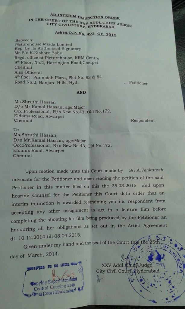 Actress Shruthi Haasan, who earlier signed to be the part of Tamil - Telugu bilingual movie directed by Vamsi starring Nagarjuna and Karthi, has walked out of the project at the last minute. Irked by the unethical act of the actress, the production house have taken the issue to the court. According to the Picture House Media, they have a initiated civil and criminal proceedings against Shruthi Haasan. The city civil court, Hyderabad have issued an injunction order restraining Shruti from signing any new movie.